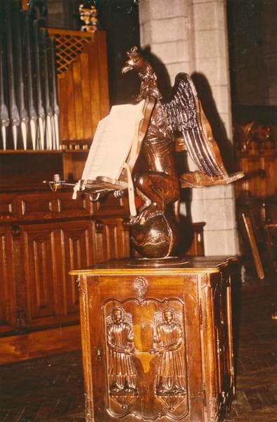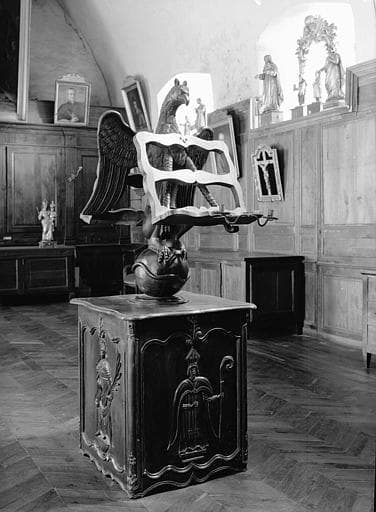 Lutrin constitué par une base de section carrée, genre bahut, supportant un pupitre représentant un animal fantastique, genre griffon.