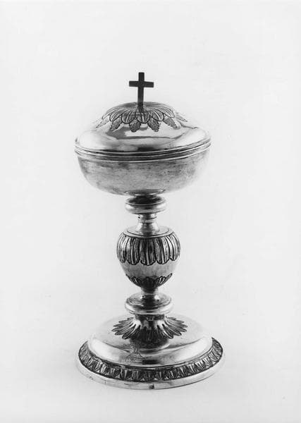 Argent repoussé, ciselé et amati. L'intérieur de la coupe est doré. Couvercle légèrement concave à son sommet avec une croix à son sommet. Noeud oviforme entre deux bagues.