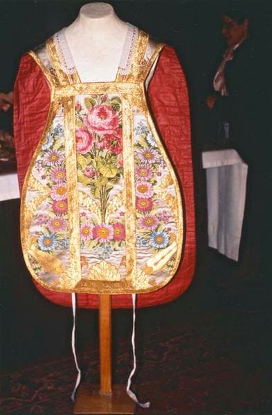 7 chapes, 5 chasubles, 8 dalmatiques, 4 voiles de calice, 6 étoles, 7 manipules, 5 bourses, voile huméral (ornement dit ornement du roi)