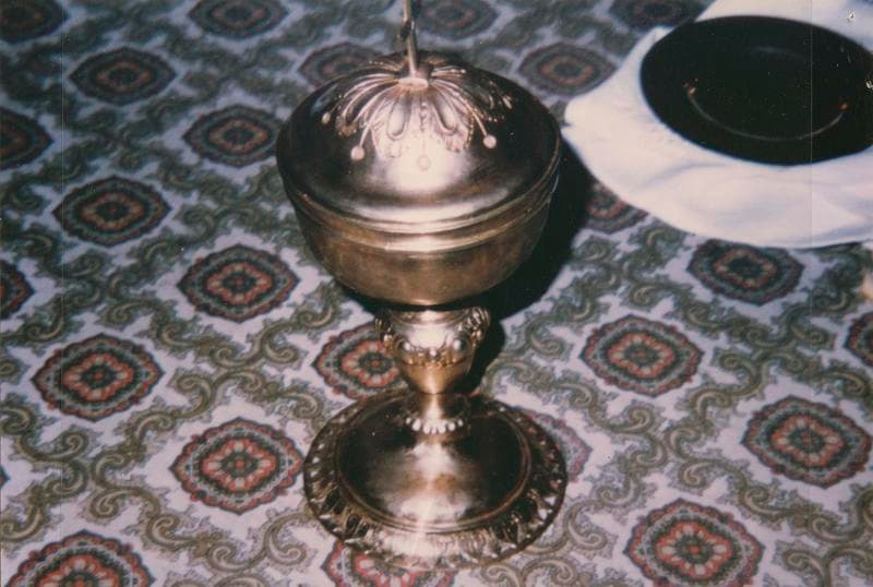 Le pied est formé d'un cercle de métal auquel sont soudées des feuilles d'acanthe découpées. Collerette à godrons, noeud décoré uniquement dans son registre supérieur par des entrelacs d'oves et de motifs floraux. Le couvercl surmonté d'une croix, offre un décor de feuilles d'eau avec canaux et de fleurettes.