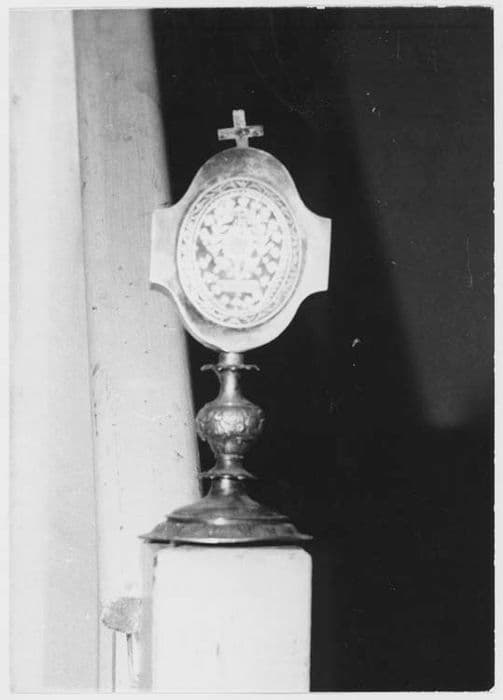 La monture du réceptacle adopte la forme d'un chapeau de gendarme, à l'intérieur un fond encollé d'une dentelle de papier accueille les reliques.