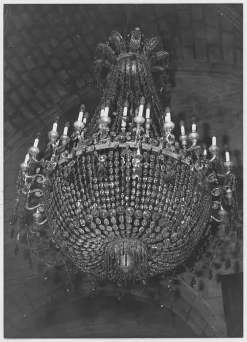 La couronne est surmontée de palmettes évidées, incurvées vers l'extérieur. Des extrémités des palmettes pendent des guirlandes de perles supportant des pendentifs ; de la couronne partent des chapelets de perles formant pennage et rejoignant la ceinture. Sur celle-ci sont fixées deux rangées de porte-lumière en forme de corne d'abondance avec un pendentif et des guirlandes allant de l'une à l'autre.