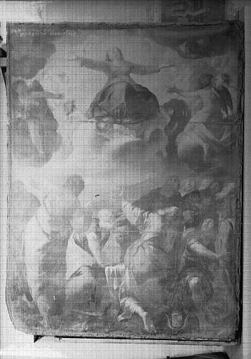signé : BLANCHARD, (FECIT ?), 1629. Armes peintes dans le bas vers la droite sont celles de la famille des Montbron qui joua un rôle important dans le développement de la Contre-Réforme à Cognac.