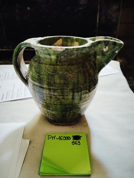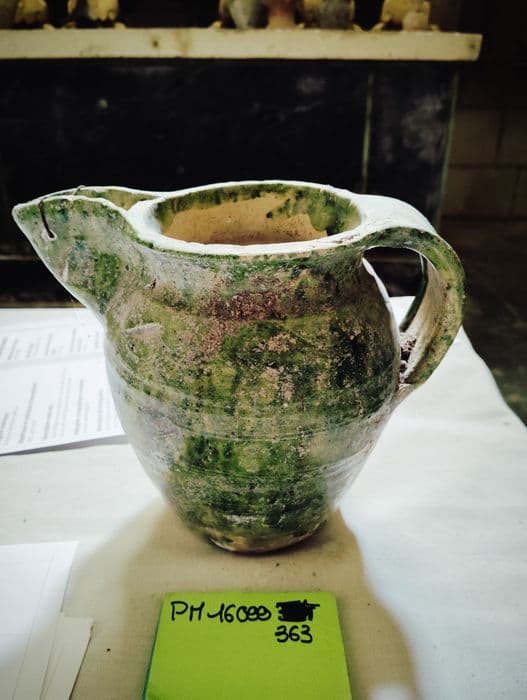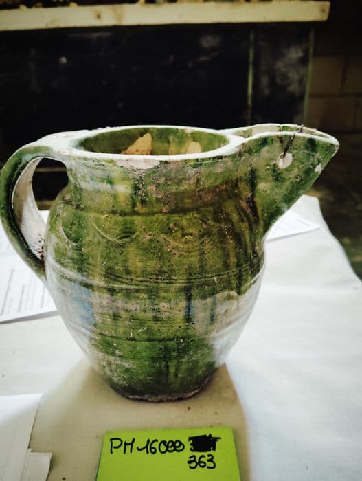 Bec ponté.£Terre ocre claire ; bec et anse modelés ; glaçure verte.