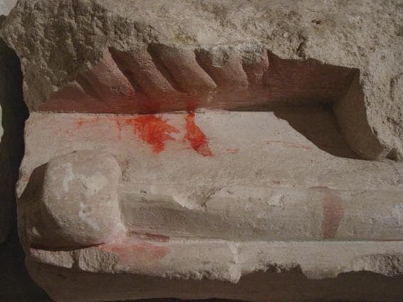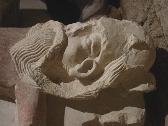 Pierre calcaire polychrome (traces de couleurs verte, rouge et rose chair), vestiges du mortier de scellement au dos.