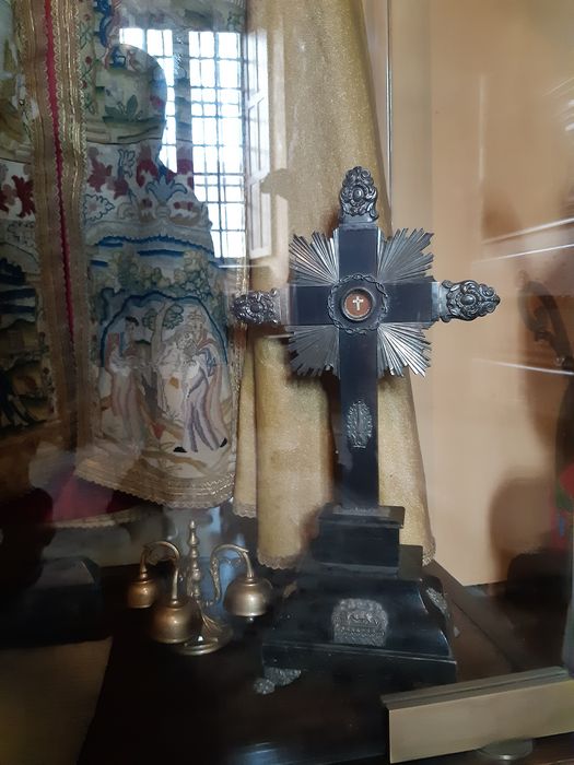 Croix reliquaire contenant une relique de la Sainte-Croix. Socle en ébène avec appliques de chaque côté : agneau, coeur de jésus, coeur de Marie. A l'intérieur du socle se trouvent deux attestations des reliques de la Sainte Croix : de Monseigneur Cousseau (1813) et du diocèse de Poitiers (1933).