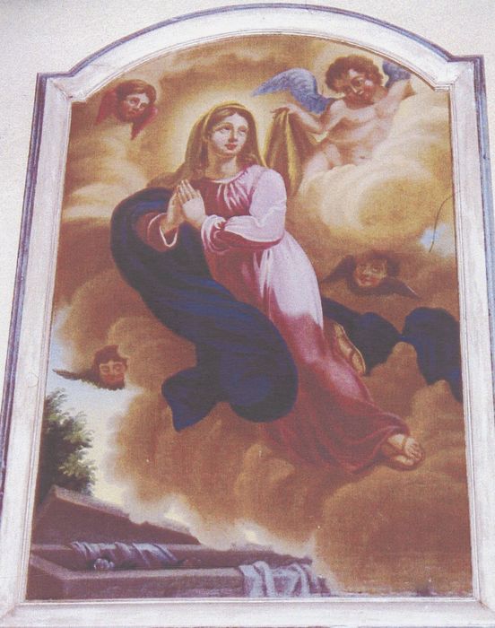 La Vierge, les mains jointes en prière, est entourée d'une nuée d'angelots.