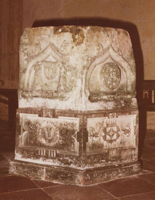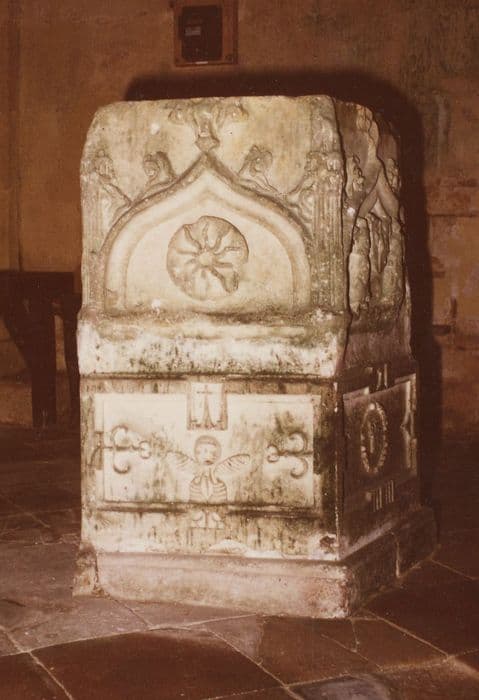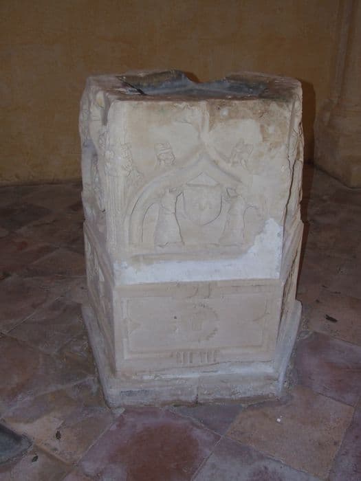 Trois côtés du bénitier seulement sont ornés.