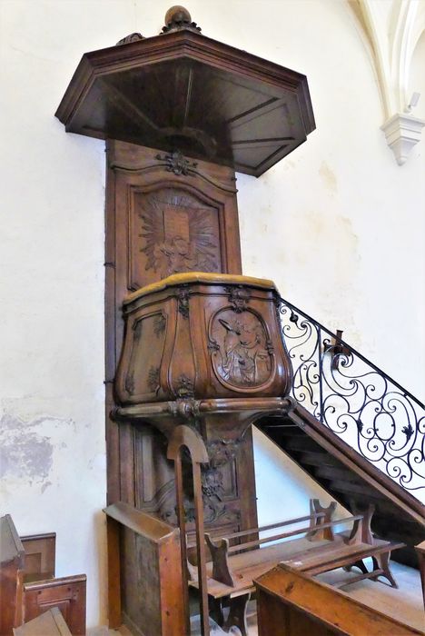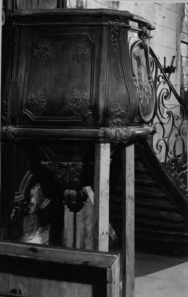 Archives du patrimoine, liasse G 277 : la chaire avait été faite pour les ursulines de La Rochelle ce qui explique que le saint Augustin en évêque qui décore la cuve porte un coeur enflammé.