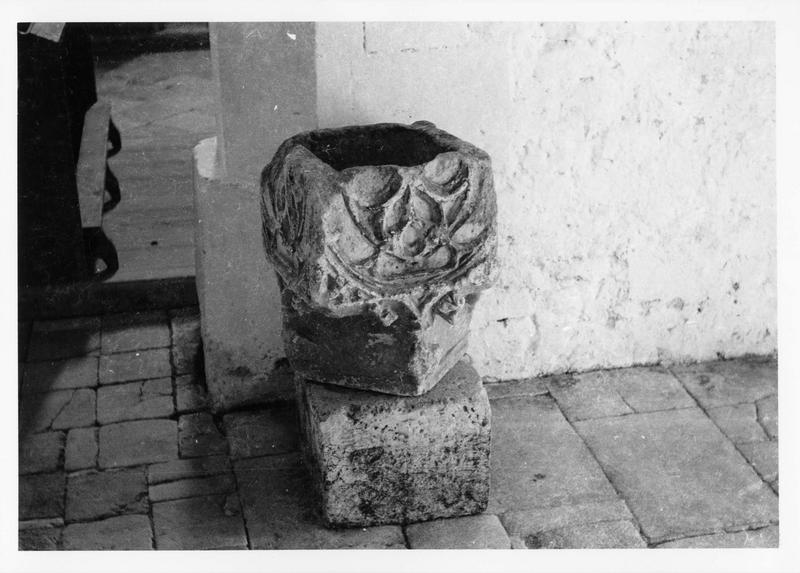 Vraisemblablement ancienne clef de voûte ou chapiteau renversé et creusé.