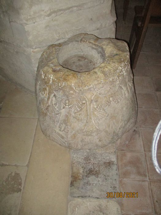 Bénitier en forme d'un chapiteau corinthien qui proviendrait peut être d'un temple d'époque gallo-romaine
