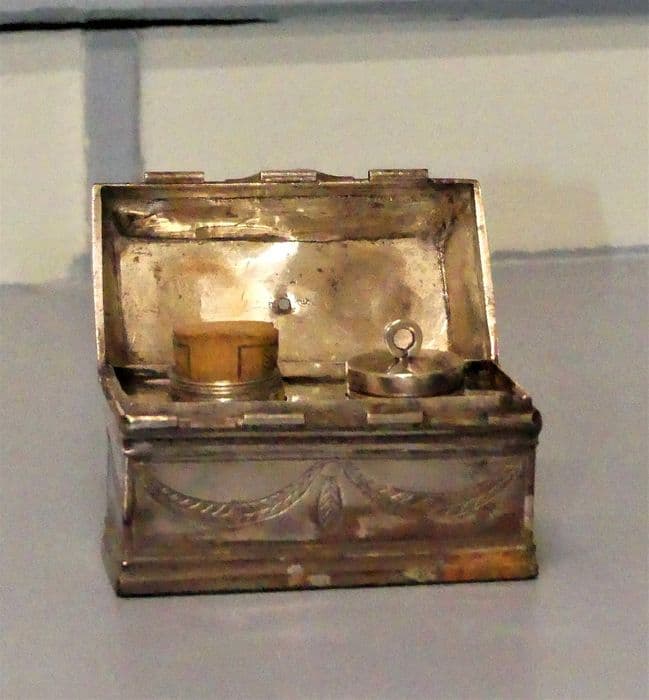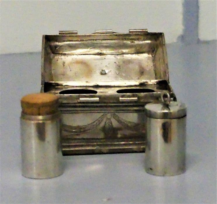 Boîte parallélépipédique, à couvercle en tronc de pyramide, contenant 2 fioles cylindriques.£Argent _flinque.