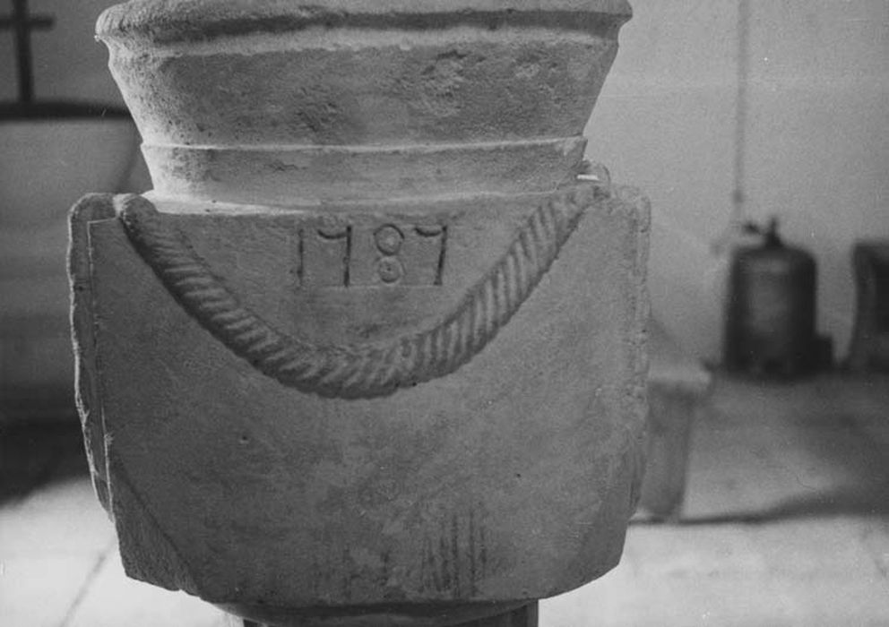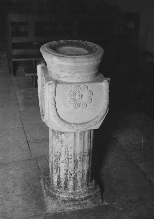 Bénitier composé d'une cuve posée sur un tronçon de colonne cannelée, et formée de deux registres : la cuve à proprement parler (de section ronde) et une bague de section carrée l'entourant, dont chaque côté est orné d'une petite fleur.