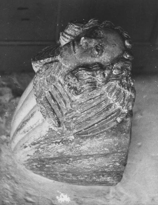 Bénitier d'applique orné d'une tête d'ange avec deux paires d'ailes.