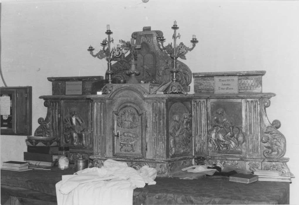 Tabernacle à ailes et à panneaux, en symétrie ; les panneaux sont ornés de bas-reliefs.