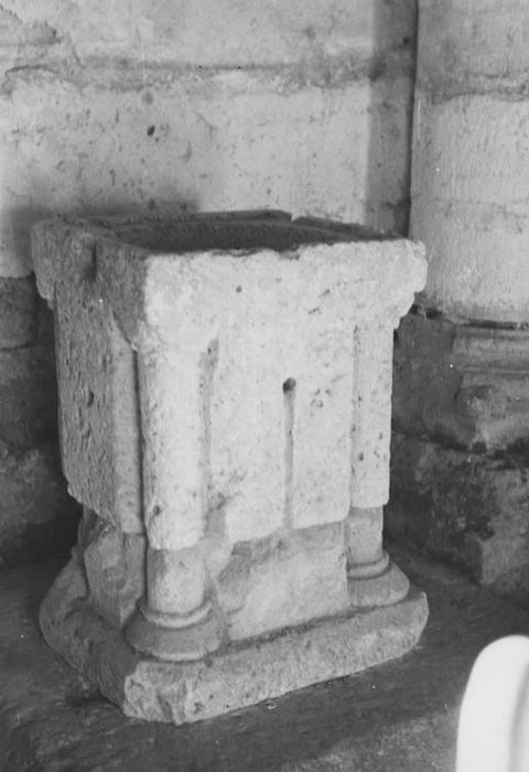 Fonts baptismaux formés d'une simple cuve à quatre côtés dont les angles sont flanqués de colonnettes.