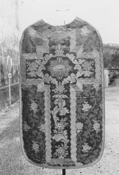 Chasuble de drap d'or avec croix semées de brocarts de soie polychrome ; agneau de fil d'argent.