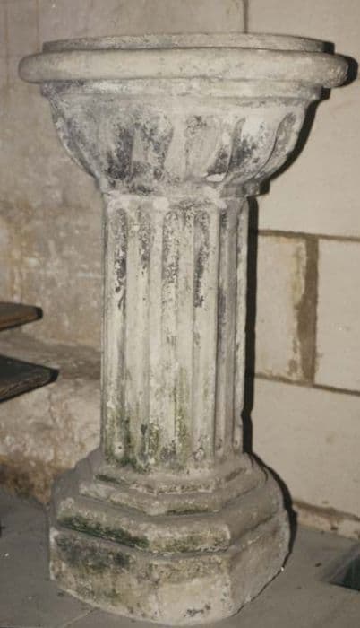 Bénitier en pierre à pied cannelé avec sa vasque en terre cuite portant une inscription.