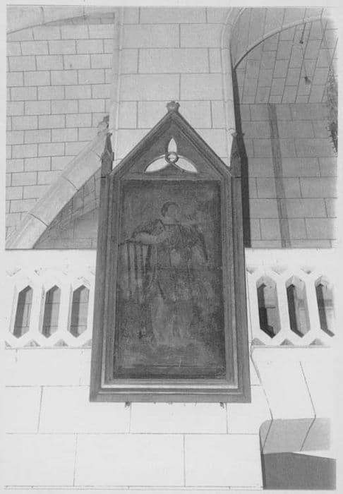 Panneau en bois dans un cadre en bois sculpté d'inspiration néogothique à formes géométriques sobres (fronton triangulaire, pinacles de part et d'autre).