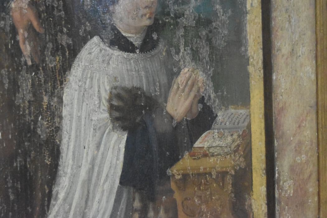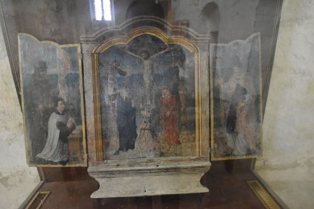 Triptyque dont le panneau central représente le Christ en croix entre la Vierge, saint Jean, Marie-Madeleine au pied de la croix et les deux larrons. Le panneau de gauche représente le chanoine Hubert de Prie à genoux les mains jointes, commanditaire, accompagné de saint Guillaume d'Aquitaine vêtu d'une armure recouverte d'un manteau et portant un casque militaire. Le panneau de droite représente un saint Hilaire de Poitiers terrassant le dragon de sa crosse.