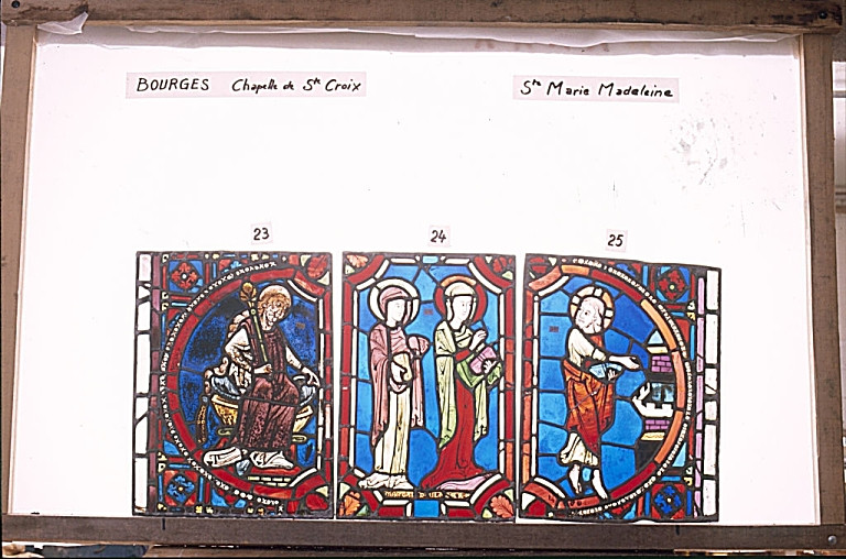 22 verrières figurées : le Jugement dernier ; l'enfant prodigue et tanneurs ; la Passion du Christ et pelletiers ; scènes de la vie des saints apôtres et martyrs ; donateurs ; le bon samaritain et tisserands ; l'Apocalypse ; la parabole de Lazare et du mauvais riche et maçons (baies 3 à 24)