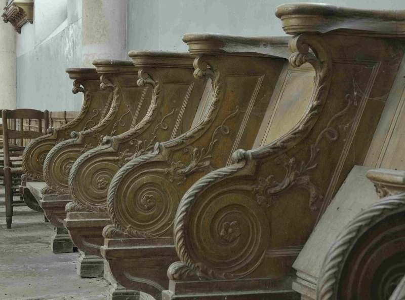Les éléments de ces stalles sont répartis dans les bas-côtés et sous le clocher. Deux rangs de cinq stalles numérotées 3 à 7 et 12 à 16. Deux ensembles de deux stalles, numérotées 1, 2, 17 et 18. Deux stalles indépendantes et incomplètes, numérotées 9 et 10. Une boiserie d'appui main assemblée constituée de cinq panneaux et six pilastres. Une boiserie d'appui main désassemblée constituée de cinq panneaux et six pilastres.