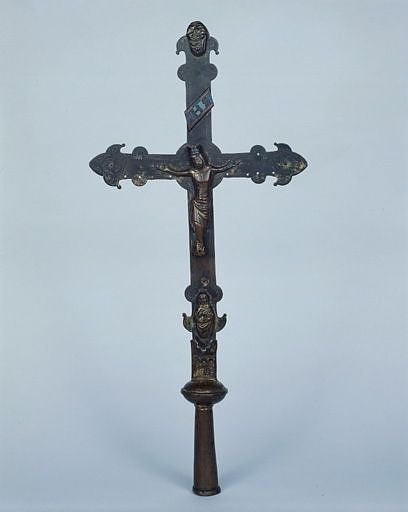 La croix florencée à croisée circulaire, le noeud et le départ du montant sont soudés entre eux ; 3 figures d'applique fondues sont rivetées sur l'avers ; seul le titulus est émaillé ; le bas du montant est fixé à un manchon plat soudé à un noeud au sommet d'une douille