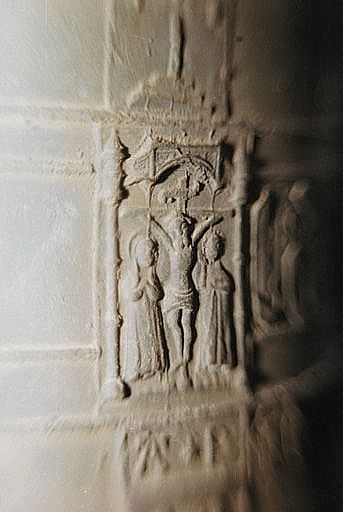 Le Calvaire et sainte Catherine d'Alexandrie sont accompagnés d'un écu.