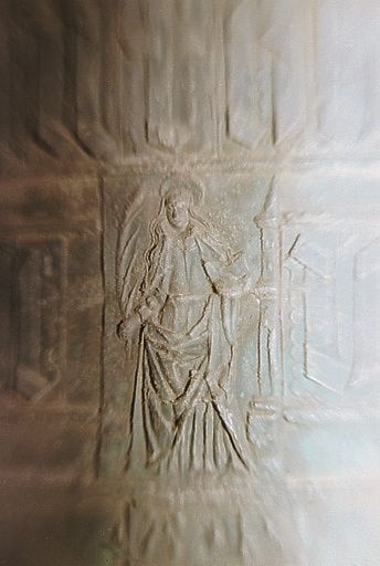 inscription concernant le commanditaire et date : SANTA CATHERINA ANTHONI SABATIE LA FET FERE L'AN MIL V C XX V T. DEUM LAUDAMUS [d'après sources] ; armoiries : fasce bastillée accompagnée de 3 étoiles et des lettres A P en chef et S en pointe