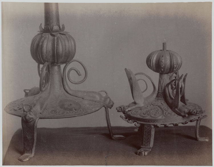 La partie émaillée du pied représente des rinceaux ; les dragons cornus et couchés se prolongent en enroulements terminés par une tête animale ; les pattes à griffe sont décorées de rinceaux ; le noeud voit alterner huit godrons et autant de canaux, les premiers figurent une feuille lancéolée, les seconds sont décorés de bandes obliques ; le noeud est enserré entre deux collerettes composées chacune de huit feuilles d'eau ; l'une d'elles est doublée par une autre collerette de même décor mais aux feuilles repliées.