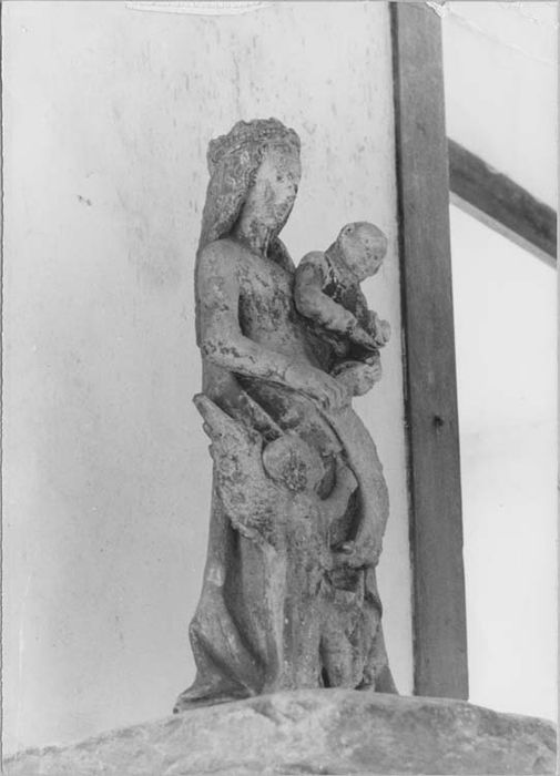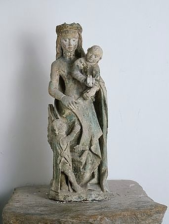 La Vierge couronnée est déhanchée, elle porte l'Enfant Jésus à sa gauche ; il incline la tête qui ne porte qu'une couronne de cheveux ; il est vêtu d'une tunique et tient une colombe dans sa main droite ; aux pieds de la Vierge, à gauche, figure un petit ange qui regarde l'Enfant et soutient de la main gauche le phylactère que présente la Vierge ; la gamme chromatique est restreinte : vert pour les vêtements et jaune pour les chevelures, les lèvres de la Vierge sont peintes en rouge.