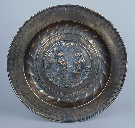 Au centre du plat, l'ombilic est décoré de l'Annonciation : l'archange est à gauche, il tient un sceptre terminé en fleur de lys, la Vierge à droite est assise, un livre est ouvert sur ses genoux, dans la partie supérieure est représentée la colombe du Saint-Esprit ; autour de l'ombilic court une inscription en caractères gothiques estampés doublée d'une rangée de feuilles ; une autre rangée de feuilles court sur le marli qui est bordé d'un motif figurant une fleur de lys entre deux grains.