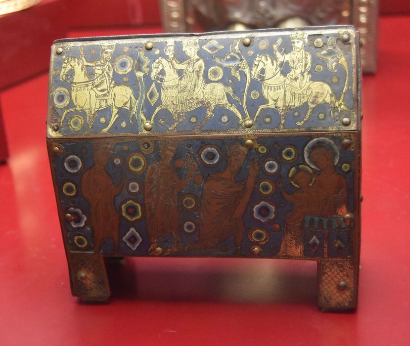 A l'avers, la plaque du toit figure la chevauchée des mages, sur celle de la caisse les mages se présentent à l'Enfant Jésus qui les bénit, assis sur les genoux de sa mère ; les figures sont traitées en réserve sur fond d'émail bleu abondamment semé de rosettes et de losange ; sur chacun des pignons un apôtre tenant un livre s'inscrit en pied dans une mandorle ; le revers est décoré d'un motif répétitif de quatre-feuilles disposés en damier.
