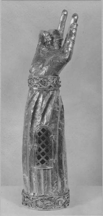 L'âme de bois est recouverte de feuilles d'argent non dorées ; la manche est bordée à ses extrémités d'une bande d'argent filigrané doré comportant des cabochons montés à bâte (plusieurs séquences où 4 petits cabochons cantonnent un plus important) ; à l'avers, au centre du bras est ménagée une porte cintrée, fixée par deux charnières à droite et une à gauche