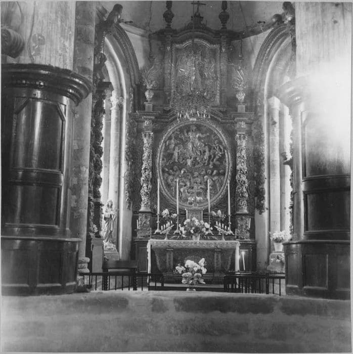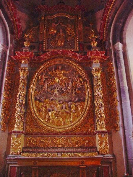 retable architecturé de la chapelle de la Vierge, 2 demi-reliefs : l'Assomption, le Couronnement de la Vierge, et 2 statues : saint Joseph, sainte Anne