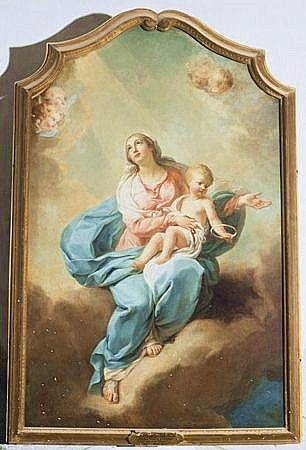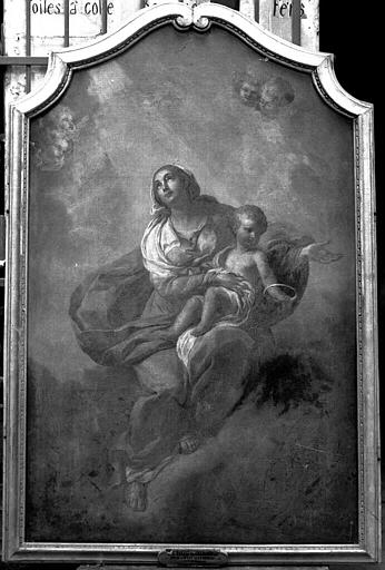 La Vierge est vêtue d'une robe rose, d'un manteau drapé bleu et d'un voile blanc. Assise sur un nuage, elle lève les yeux et la main gauche, paume ouverte vers le haut, au ciel vers la gauche d'où tombe un rayon de lumière ; de la main droite elle tient un rosaire et retient l'enfant qui est assis sur son genou gauche. L'enfant Jésus dirige son regard vers le bas à gauche et tend de sa main gauche une auréole dorée. Le ciel, dans sa partie supérieure, est peuplé de deux paires d'angelots disposées de part et d'autre du rayon de lumière.