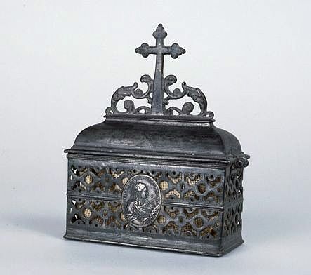 Le corps du coffret rectangulaire se compose de quatre plaques d'étain ajourées soudées au fond constitué d'une autre plaque non ajourée ; sur l'avers le coffret présente un regard rectangulaire autrefois vitré ; au revers est rapporté un médaillon ovale ; le revers de la plaque du fond porte quatre traces de soudure formant un carré (fixation d'un pied ?) ; les sommets des petits côtés sont dotés de charnières qui servent à la fixation du couvercle ; rectangulaire également, il est surmonté d'un motif fondu et ajouré, rapporté ; à l'intérieur du coffret est placé un réceptacle rectangulaire en fer étamé comportant un regard vitré