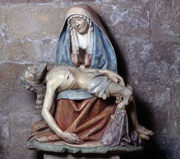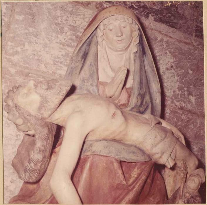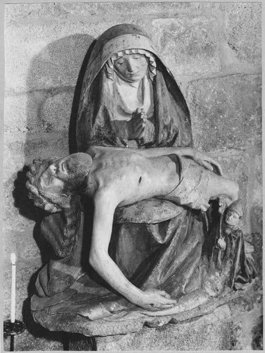 groupe sculpté (petite nature) : Vierge de Pitié avec un évêque en donateur