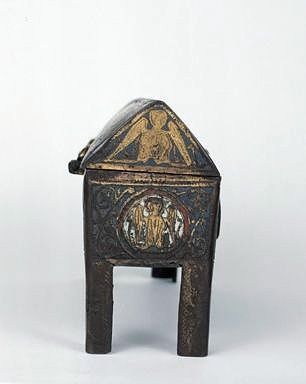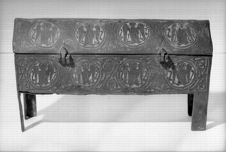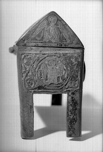 Châsse en forme de sarcophage sur hauts pieds ; dépourvue d'âme de bois elle ouvre par un toit en bâtière fixé par des charnières ; une serrure est fixée à l'intérieur de la caisse ; la châsse est dépourvue de crête ; deux petites boîtes à reliques vitrées ont été soudées sur la face principale