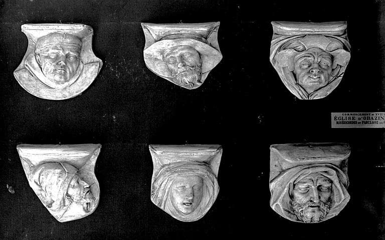 Ensemble dispersé en 12 parties ; les stalles comportent des sellettes à miséricordes pivotantes sur des charnières ; 3 stalles sont prolongées par des dossiers élevés