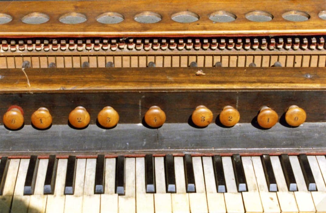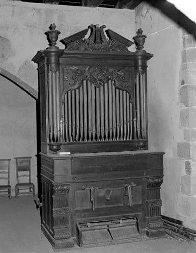 2 claviers ; clavier 1 (inférieur, 61 notes) : 8 v violoncelle, 32 b baruphone, 8 voix de basse, 8 cor anglais, 8 flûte, 16 clarinette, jeu manquant, 32 saxophone, 8 et 4 violetta ; clavier 2 (supérieur, 61 notes) : 8 h harpe éolienne, 4 v. H voix humaine, 8 c. N. Cor de nuit, 16 contrebasse, 8 baryton, 4 clairon, 4 fifre, 4 flûte suisse, 8 hautbois, 16 voix humaine, 16 harpe éolienne, 16 musette.