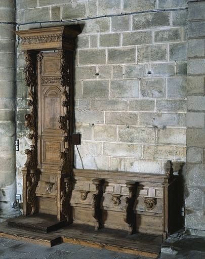De gauche à droite, les miséricordes représentent : une tête de femme dont la coiffure s'agrémente d'un voile noué, une tête de moine sous une capuche, le profil droit d'un homme barbu coiffé d'un grand chapeau, une tête d'homme coiffé d'un chapeau à bordure tréflée ; les demi-montants sont sculptés d'enroulements, de feuilles d'acanthe, de têtes en ronde-bosse (homme voile, femme voilée) prolongées par des ailes ou des feuilles d'acanthe ; l'un des montants comporte au sommet une tête de Corbin ; le panneau à gauche de la stalle haute est cantonné de rosettes et sculpté de feuilles d'acanthe et de fleurons ; les montants du dossier développent des enroulements où figurent des feuilles d'acanthe, des chutes de fleurs, deux têtes de personnages en ronde-bosse (différentes selon les montants), leur base est matérialisée par l'avant train d'un lion émergeant d'un bouquet d'acanthe ; le dossier est décoré de panneaux moulurés ainsi que de demi-pilastres cannelés surmontés de demi-chapiteaux ioniques d'où s'élancent des guirlandes florales ; le panneau central cintré est surmonté de rinceaux et de fleurs ; la corniche moulurée est sculptée d'une rangée d'oves et d'une autre de feuilles d'acanthe ; à l'extrémité droite le motif d'amortissement est orné de feuilles d'acanthe et de fleurons, il était surmonté d'une boule en marbre.
