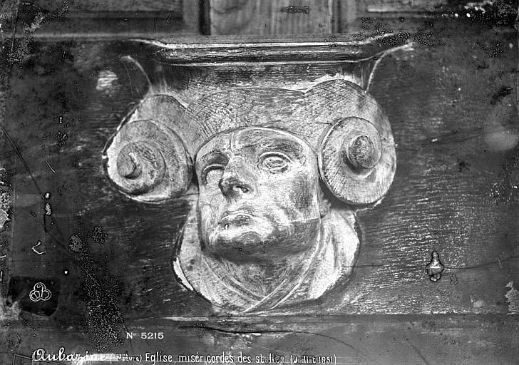 De gauche à droite les miséricordes représentent : une tête d'homme tourné vers la gauche coiffé d'un chapeau à enroulements, une tête d'homme avec des moustaches ouvrant la bouche ; les montants sont sculptés d'enroulements, de feuilles d'acanthe, de têtes en ronde-bosse (jeune homme, homme avec une capuche, homme voilé) prolongées par des ailes ; l'un des montants comporte au sommet un enroulement orné d'un entrelacs.
