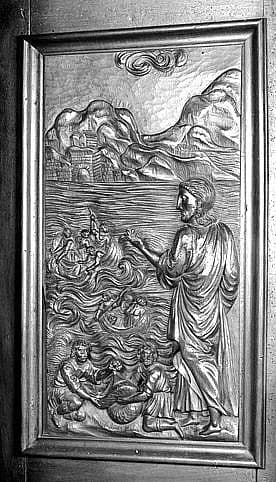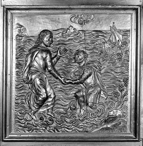 3 bas-reliefs : la Pêche miraculeuse, saint Pierre marchant sur les eaux à l'appel du Christ, la Conversion du centurion Corneille