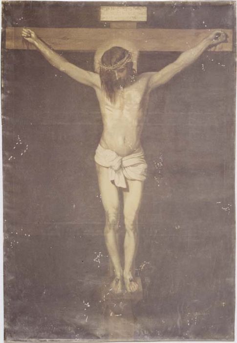 inscription peinte sur le titulus en trois lignes (hébreu, grec et latin) ; toile signée et datée : EMILIE BRUINE 1869 ; inscription au dos du châssis : 1869, EMILIE BRUINE VEUVE PRUYATE D'APRES VELASQUEZ