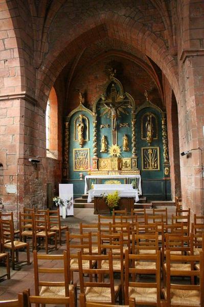 L'autel rectangulaire repose sur deux degrés en bois et un troisième en pierre