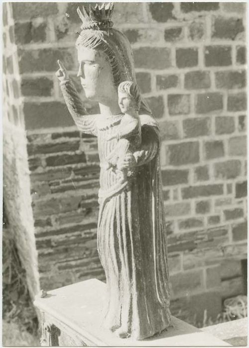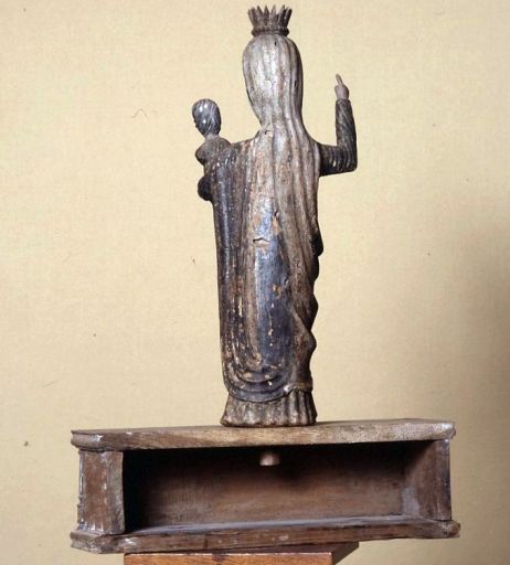 La Vierge est couronnée, elle est debout et tient l'Enfant Jésus sur son bras gauche pendant que le bras droit se lève en un geste de bénédiction. Les plis de la robe tombent en plissés gaufrés ainsi que ceux qui recouvrent les bras (à la manière espagnole). Le voile posé sur les cheveux passe dans le dos et est retenu sur le devant par une cordelière. L'Enfant Jésus porte une robe qui s'arrête aux genoux, ses pieds et sa main restante sont finement travaillés. Façade du socle cantonnée de colonnettes et sculptée d'un angelot flanqué de chutes de draperies.