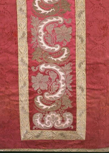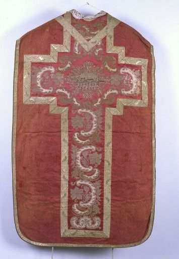 Rare ornement rose (le rose est porté le 3e dimanche de l'Avent et le 4e de Carême), datant du 19e siècle, avec peut-être un remploi de soie brodée en parement de la chasuble.