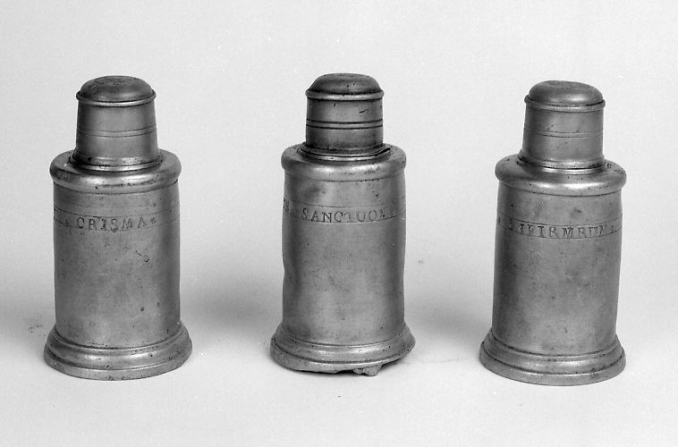 Arrêté préfectoral : Réserves aux saintes huiles (réserve à huile des catéchumènes, réserve à huile des malades, réserve à saint Chrême), étain, inscriptions gravées sur sur la panse (Sanctum Chrisma, Oleum Sanctuom (pour Sanctum), et Oleom Infirm (o) rum), fin du XVIIIe ou début du XIXe siècle, dans la sacristie.