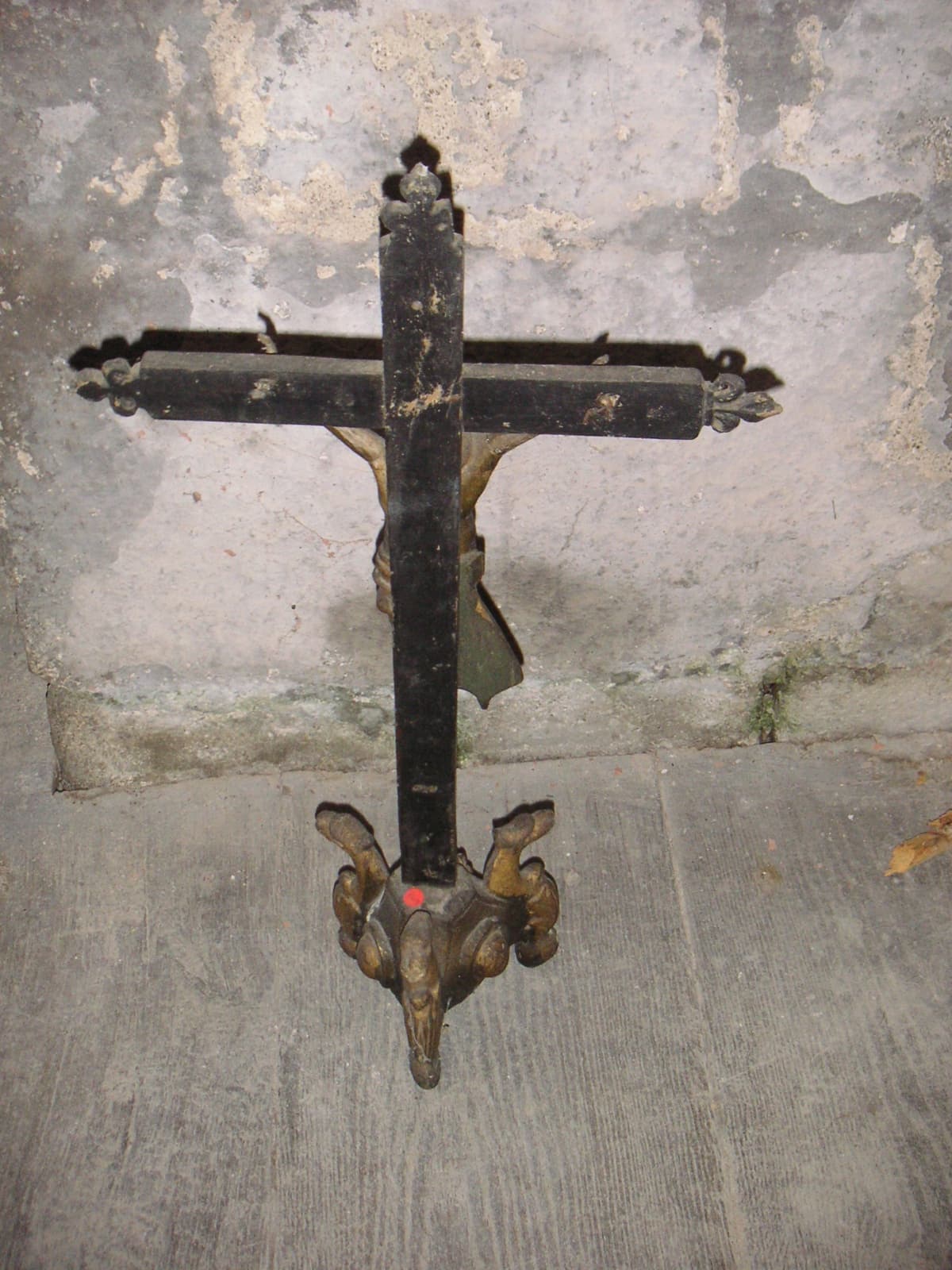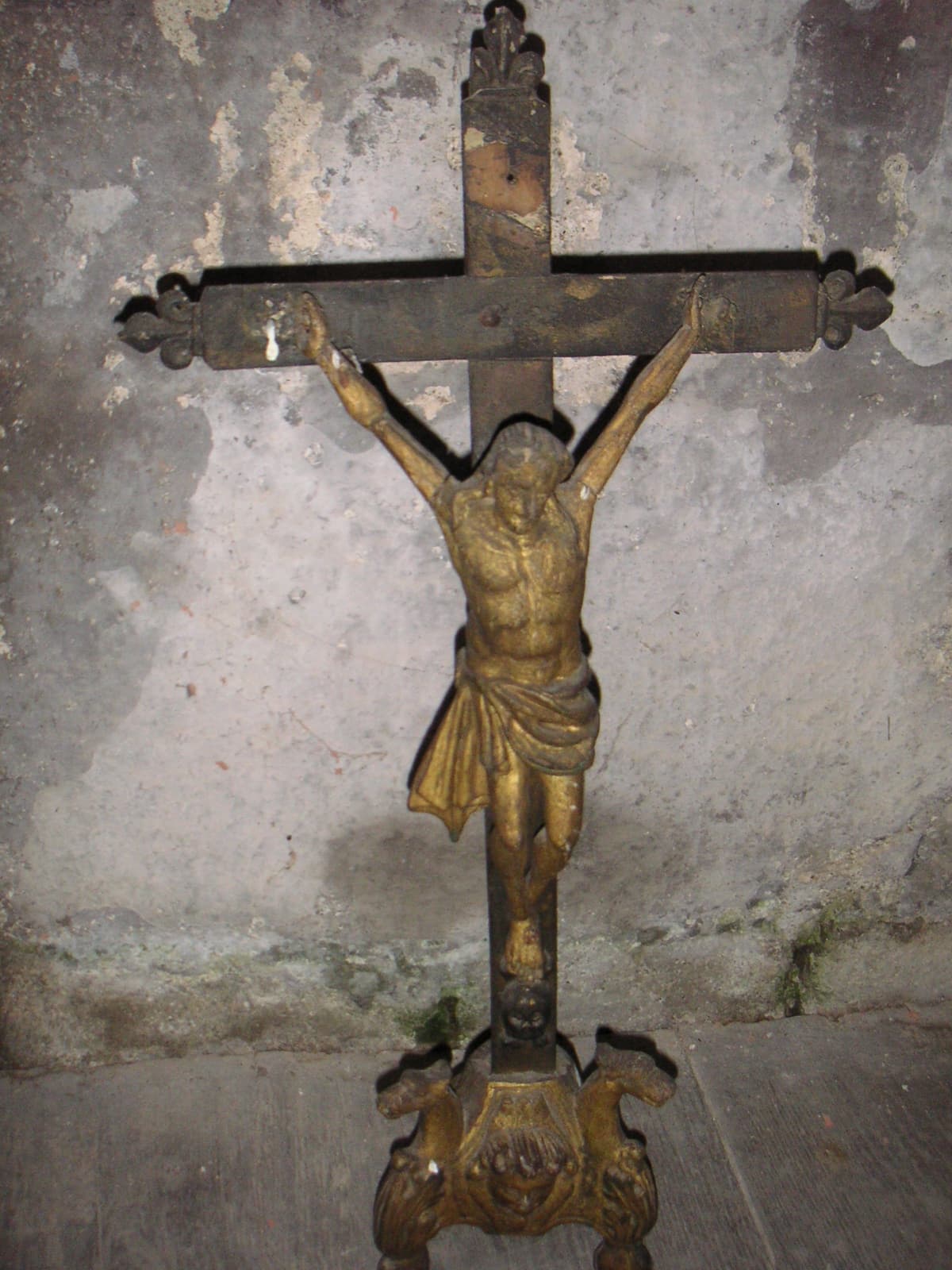 Socle doré, croix peinte en noir, bras du Christ assemblés à tourillon.